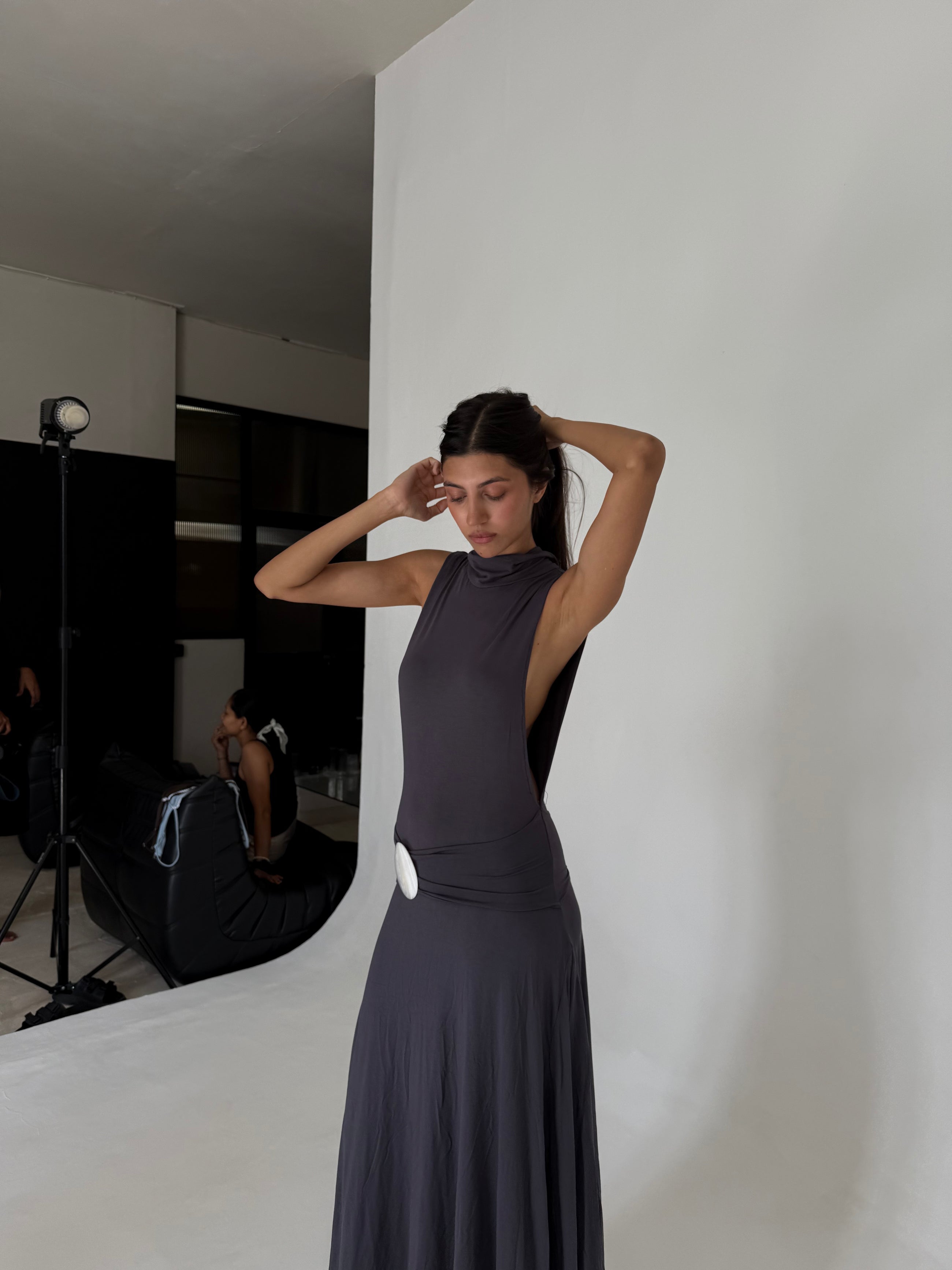 A sleek, sensual, curve-skimming showstopper, our jersey dress Elba delivers maximum drama with Shell buckle accessories